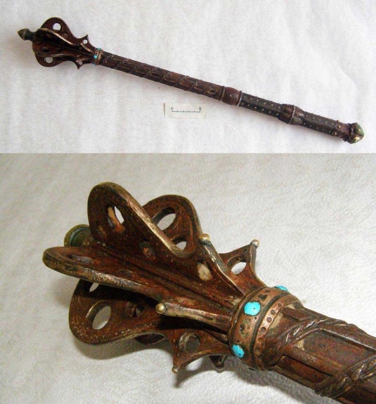 1. Рукоять изначально отковывалась отдельно, по крайней мере, очень на это похоже. 2. Голова ковалась целиком из единого куска. Те экспонаты, что находятся в музеях, не имеют видимых признаков сборки, этот факт отмечают многие эксперты. 3. Голова и рукоять сваривались, плюс приваривалась небольшая кольцевая гарда — защита для рук.