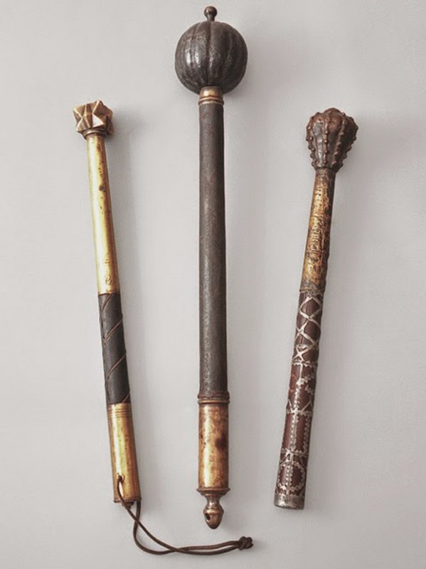 Слева: типичная европейская булава XII — XIII веков с металлическим навершием в виде многогранника. Деревянная рукоять окована металлом и украшена витой медной проволокой. Справа: булава с металлическим грушевидным навершием, усиленным мелкими скругленными шипами. Навершие оснащено металлической втулкой для насада на древко, а само древко украшено резными полосками белого металла, образующими узоры. В центре: простая тяжелая железная булава с шарообразным навершием. Железное «древко» оковано желтым металлом.