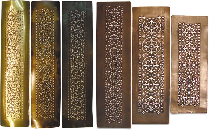 точно передаст все особенности рельефа: изгибы, выступы, впадины. Получится своеобразная ко-пия литого рельефа. Но пока это будет только от-дельная часть узора в полосе (раппорт). Припод-няв пуансон, передвиньте полоску из листового металла и выполните тиснение следующеюго её участка. Выполнив таким образом оттиск вдоль всей полосы, внимательно осмотрите рельефный узор. Если его детали где-то получились не со-всем четкими, проработайте их инструментами, применяемыми в чеканке, — чеканами, гладилками, канфарниками.