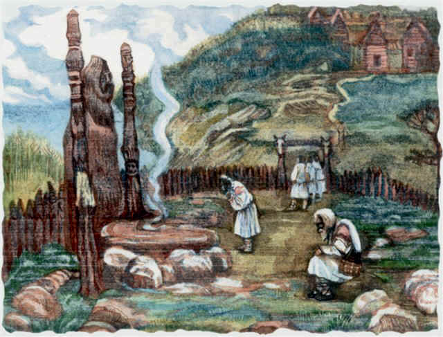 «…И нача къняжити Володимеръ в Кыеве единъ. И постави кумиры на хълму вне двора теремьнаго: Перуна древяна, а главу его сьребряну, а оусъ златъ, и Хърса, Дажьб’а и Стриб’а, и Съмарьгла, и Макошь.»
