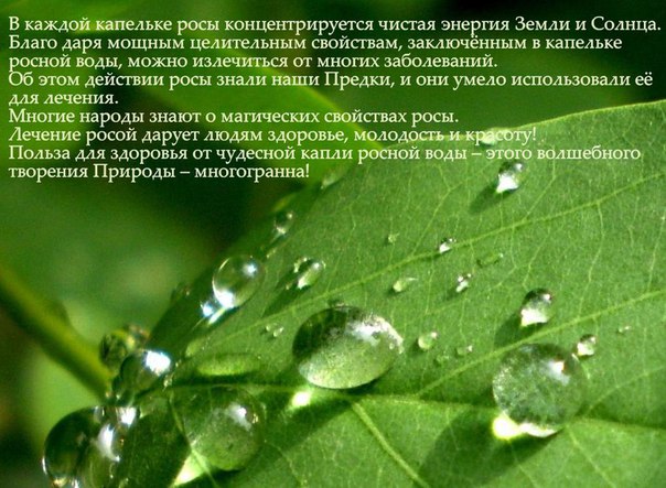 В каждой капельке росы концентрируется чистая энергия Земли и Солнца. Благо даря мощным целительным свойствам, заключённым в капельке росной воды, можно излечиться от многих заболеваний. Об этом действии росы знали наши Предки, и они умело использовали её для лечения.