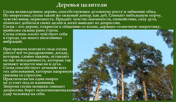 Сосна – дерево спокойствия, оно лечит нервные расстройства и все заболевания связанные со стрессами. Для людей с больным сердцем полезны длительные прогулки в сосновом бору, но только не в жаркую погоду, когда летучие вещества, выделяемые сосной, могут оказать излишне возбуждающие действия. Сосна – милосердное дерево, оно способно не только очистить ауру человека, но и частично снять порчу.