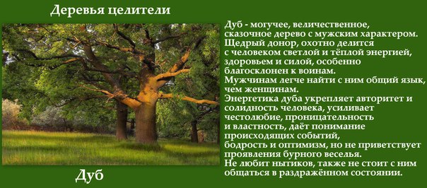 Дуб – дерево жизненной силы, долголетия, дерево-донор. Прямой контакт с ним полезен тем, кто часто страдает от беспричинной усталости, внутренней апатии, в основе которой лежит недостаток жизненных сил. Дуб – сильное, но суровое дерево, оно не принимает нытиков, не терпит отчаявшихся. Дуб отдает предпочтение борцам, он врачует раны воинам, лечит их души. Именно ветеранам, пожилым людям принесет пользу общение с этим деревом.