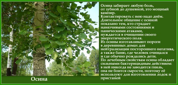 Мы уже говорили, что одни деревья обладают положительной энергией: береза, дуб, сосна, каштан, клен, ясень, липа, ива; а другие — отрицательной: осина, тополь,, черемуха, ольха. Но эти деревья и лечат, снимая боль, выводя болезненную энергию.