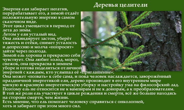 Ель — единственное дерево, которое в отличие от прочих не засыпает на зиму. Оно предложит вам свою энергетическую поддержку круглый год, а не только летом. Хотя ель и не несет в себе особенно сильных свойств, ее энергия будет доступна тем, кто ощущает недостаток сил в зимние месяцы.