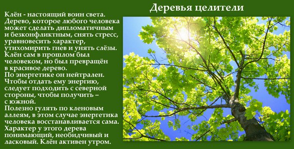 Клён – дерево обретения равновесия. При контакте с ним человек становится спокойным, так как оно принимает на себя переполняющую человека избыточную энергию, утихомиривает ярость, гнев, делает нас уравновешенными и выдержанными. Взамен слез, тревог и уныния это дерево подарит вам успокоение, уверенность в себе.