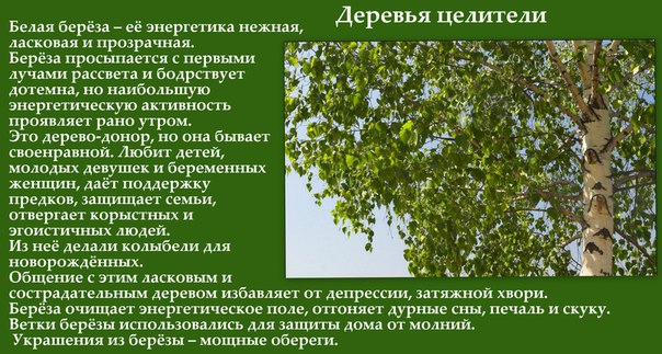 Береза – нежное, сострадательное дерево с очень мягким, ласковым, но в то же время сильным влиянием. Именно к березе следует обращаться больным, ослабленным и выздоравливающим людям. Она облегчит страдания, поможет легче перенести болезнь. Для человека с расстроенными нервами береза просто незаменима. Это ласковое дерево избавит вас от страха перед будущим, от бесплодных хлопот, от напрасных тревог. Береза, растущая рядом с домом, обладает чудесным свойством отгонять кошмарные сны. Многие считают, что береза подходит всем, но это не так. Только тот, кто искренне любит это дерево, получит от него энергетический заряд.