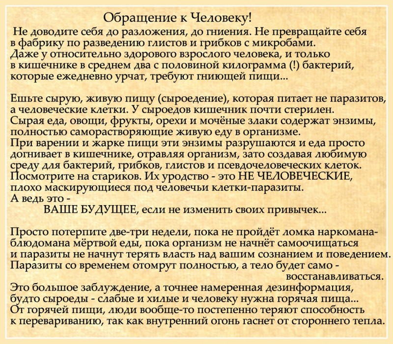 Ешьте сырую, живую пищу (сыроедение), которая питает не паразитов, а человеческие клетки. У сыроедов кишечник почти стерилен. Сырая еда, овощи, фрукты, орехи и мочёные злаки содержат энзимы, полностью саморастворяющие живую еду в организме. При варении и жарке пищи эти энзимы разрушаются и еда просто догнивает в кишечнике, отравляя организм, зато создавая любимую среду для бактерий, грибков, глистов и псевдочеловеческих клеток.