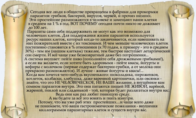 Когда вам хочется чего-нибудь вкусненького: шоколадика, пироженков, котлеток, колбаски, хлебулка, даже варенной картошечки, или овсянки — знайте, что это НЕ ЧЕЛОВЕЧЕСКОЕ, НЕ ВАШЕ желание, а внушённое вам сомном паразитов внутри. Это они питаются пищей НЕ ЖИВОЙ, варёной, жареной, гнилой или сладенькой — той, которая будет разлагаться внутри. Ведь они как раз любят гниющую среду. А Вы будете за всё это вонять и гнить изнутри. Потому, что вы уже раб этих простейших… и чаще всего даже не понимаете, что ваши гастрономические пожелания — внушения киллограммов паразитарных клеток и существ внутри вас.