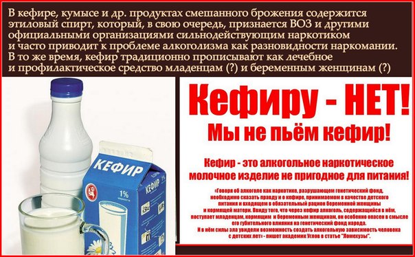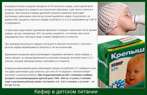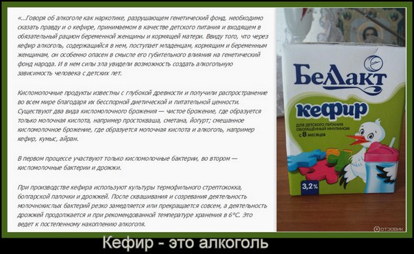 «Дело в том что кефир это продукт двойного брожения, кисломолочного и дрожжевого. По ГОСТу в детском кефире допускалось до 0.5% алкоголя при его изготовлении. Но, когда бутылочка с кефиром стоит четыре часа на подоконнике, а она почти всегда стоит столько на подоконнике, процесс бродильный идет процент алкоголя повышается до 1,5% когда ребенок съел этот кефир, у него в желудке продолжается бродильный процесс и концентрация доходит до 3%.