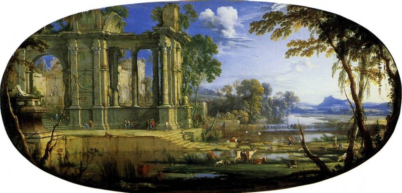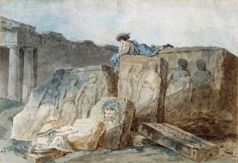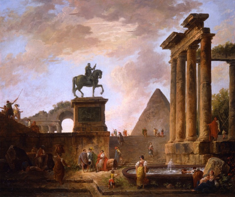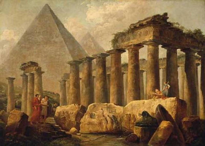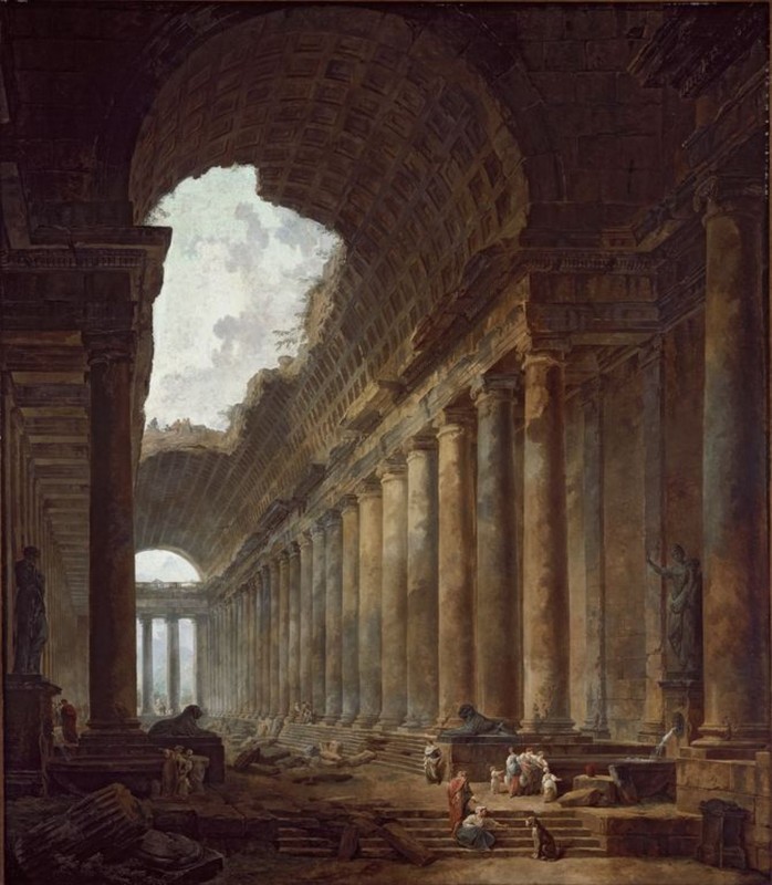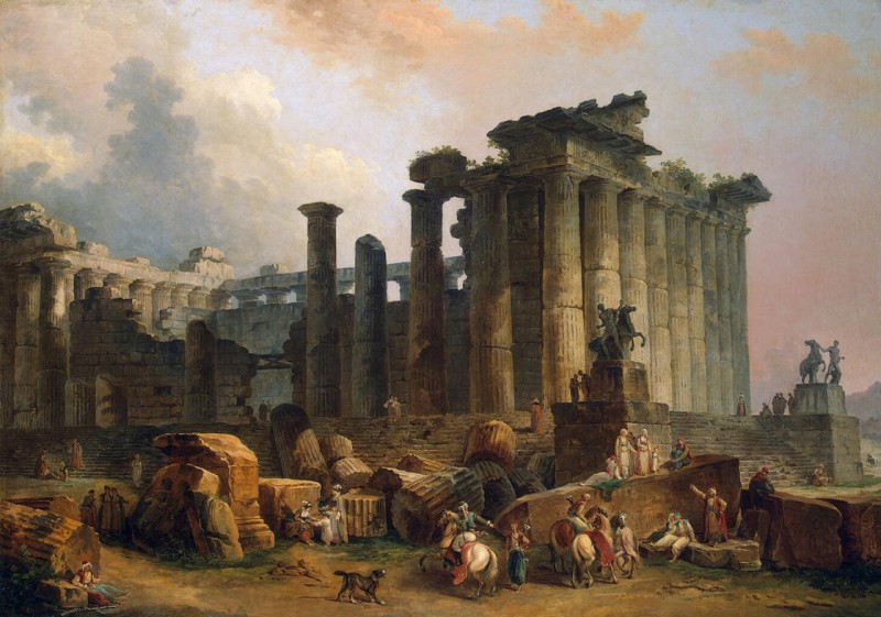 Как вы сами видите, главный персонаж творений – античные руины. Ничего нового, только на руинах не быдло со скотом, а «нормальные европейцы». Средний класс и знать. Но сути это не меняет. Некоторые руины существуют и поныне в виде отреставрированных сооружений, или откровенных новоделов. Но большая часть того, что окружало людей ещё совсем недавно, безвозвратно разворовано, растащено на неотложные хозяйственные нужды.