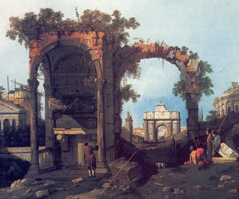 Вот что пишут все современные энциклопедии и справочники по поводу -«руинистической» живописи: — «___ ПОДСТАВЬТЕ НА ЭТО МЕСТО ИМЯ ЛЮБОГО ИЗ, ВЫШЕПЕРЕЧИСЛЕННЫХ ХУДОЖНИКОВ____ — известен живописными фантазиями, чей основной мотив — парки и реальные, а чаще воображаемые «величественные руины» (по выражению Дидро), множество набросков к которым он сделал во время пребывания в Италии».