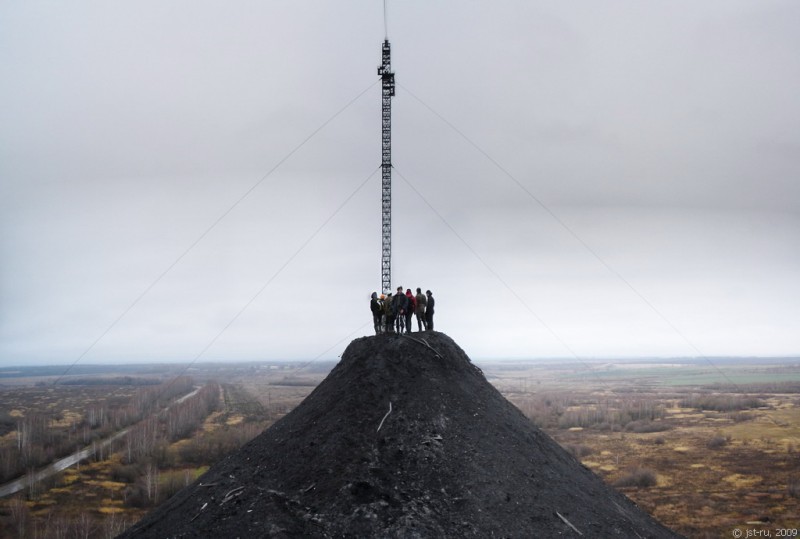 Здесь видно, что по ребру террикона идет транспортировка отвальной породы