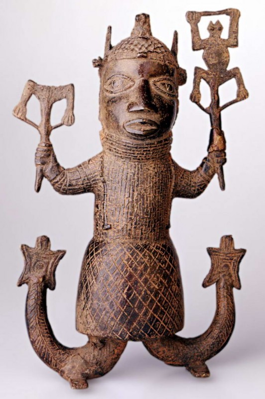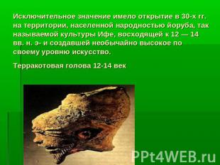 В этих же местах в Нигерии живет удивительный народ йоруба. Задолго до появления в Западной Африке европейцев (начиная с 15 в.) у них существовали государства. Йоруба — создатели (расцвет в 12-14 вв.) замечательной бронзовой и терракотовой скульптуры (см. Ифе). Значительная находка, найденная в городе Ифе, бронзовая, несомненно, очень древняя и прекрасная скульптура, была сделана членами немецкой экспедиции в роще, посвященной йорубскому богу моря Олокуну. Фробениус(немецкий археолог) вспоминал: «Перед нами лежала голова изумительной красоты, чудесно отлитая из бронзы, правдивая в своей жизненности, покрытая темно-зеленой патиной. Это был сам Олокун, Посейдон Атлантической Африки». Фробениус просматривал явную связь этой цивилизации со средиземноморской (http://www.liveinternet.ru/users/2457042/post75888539).