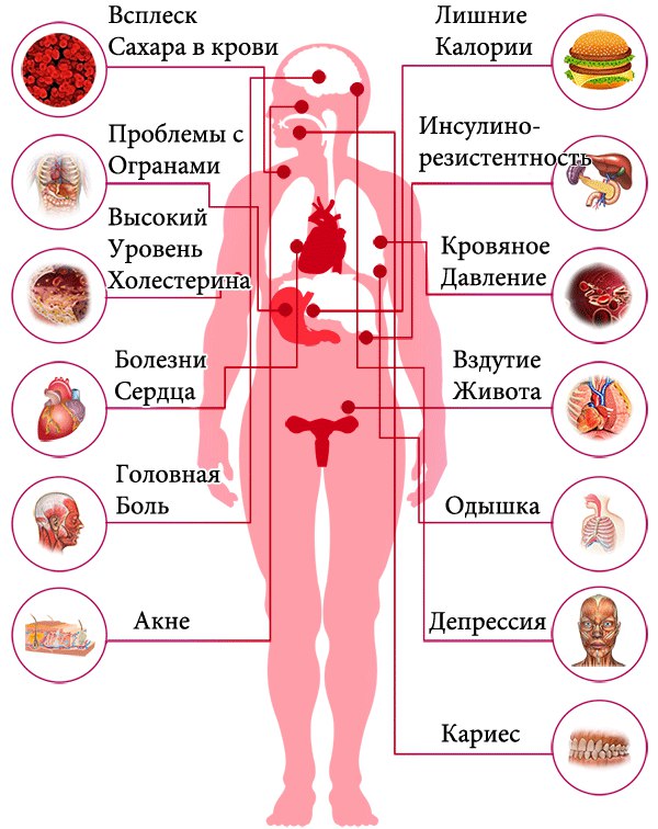 4. САХАР. Все продукты, содержащие сахар, вызывают резкий скачок сахара в крови. Сахар вызывает в мозгу выброс естественных опиатов. Однако уровень сахара в крови падает также стремительно, как и поднимется, и человек чувствует острый приступ голода. Сейчас очень распространен стереотип, что углеводы – главная причина набора избыточного веса. Вследствие этого большую популярность получили безуглеводные диеты, без овощей и фруктов. Безуглеводная диета опасна и уже скоро выльется в серьезные проблемы с пищеварительной системой. Углеводы, которые Вы получите из овощей и фруктов никогда не приведут к ожирению. Они просто незаменимы для питания клеток и сохранения жизнеспособности человеческого организма. Из всех углеводов единственно вредными являются сахарный песок и избыток крахмала, поэтому необходимо контролировать потребление содержащие их продукты.