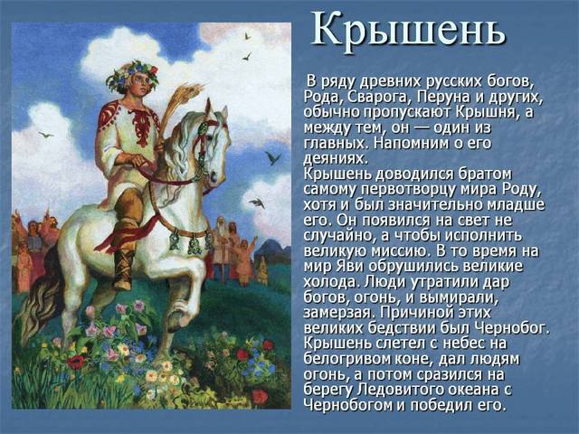 Славянская языческая мифология делит с индийской мифологией помимо многих богов, делит и ещё одного бога — Крышеня. Не трудно догадаться, какому именно индийскому богу созвучно имя этого божества. Кришна — Крышень. Судить о славянском происхождении имени довольно-таки сложно. На ум сразу приходит слово «крыша». Давайте немного поразмышляем какая связь может быть между этим словом и именем самого бога Крышеня. Итак, что мы знаем о крыше?! Это плоскость, призванная защищать дом от внешних природных факторов. Отсюда слова «крыть», «накрывать», «укрывать». В семантике этих слов лежит одно и то же действие, оберегать от чего-то, сохранять то что внутри. Так и крыша хранит дом, в котором вы обитаете и вас самих. Разве нет?! А ещё крыша держит то, что творится в вашем доме, то есть ваше тепло и энергию. В древности у каждого построения была своя крыша, своей особой формы. В старину люди верили, что у каждого места есть своя специфическая энергия, которая зависит от предназначения самой постройки и тех действий, которые в ней совершались. Крыша у избы, обычно имела пирамидальную форму, где четыре плоскости стремились вверх к одной точке, которая смотрела прямо в небо. Так вот, это посыл человеческой энергетики в космос. Итак, мы немного отошли от самой темы обсуждения. Крыша-укрывает, защищает, сохраняет тепло. Бог Крышень был рождён для того, чтобы спасти мир Яви от лютого властвования Чернобога и вернуть огонь и тепло людскому роду. Говоря проще, Крышень, укрыл и согрел Явий мир. Не находите никакого сходства?! Лично автор видит. Так, что, говоря его словами бог Крышень судя по дошедшим до нас преданиям, это защитник и тот, кто хранит людское тепло, крыша для мира людей, так сказать. Скорее всего название части нашего дома как раз и произошло от имени славянского божества. Это конечно всё доводы автора, и они могут в корне отличаться от научных трудов всяких исследователей. Это просто попытка, обычного человека проследить связь между прошлым и тем языком, на котором он говорит. Каждое слово, ведь хранит свой тайный смысл и историю происхождения. Если говорить о родстве славянского Крышеня и индийского Кришны, то рассмотрим откуда произошло имя второго. Как всегда, мы корнями уходим в древний санскрит, где слово «krsna» дословно означает «чёрный», «тёмный». Статуи бога Кришны либо чёрные, либо разных оттенков голубого и синего. По одной версии это свидетельствует о неарийском происхождении божества, другие утверждают, что имя Кришны можно интерпретировать, как «подобный облакам». Что общего у синего Кришны и белокурого славянского Крышеня в таком ракурсе судить весьма сложно. Если вспомнить, что нашего Вышеня обычно изображали и представляли верхом, то на коне, то на гигантском орле, парящем в облаках, то в принципе, утверждение о подобности облакам, так или иначе логически вытягивает гипотезу родства двух богов. Хотя может, наших предков просто смутила смуглая кожа божества?! Мало ли, ведь этим вряд ли можно было удивить племена и народы населяющие историческую территорию Индии и близ лежащих стран.