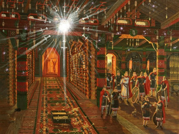 Двое ворот города открыты для всех приходящих; третьи, самые малые обращены на восток, ведут к морю (озеро Толензезе), лежащему поблизости и на вид ужасному. У этих ворот не стоит ничего, кроме искусно построенного из дерева храма, в котором опорные столпы заменены рогами различных зверей. Стены его извне, как всякий может видеть. украшены чудесной резьбой, изображающей различных богов и богинь, а внутри стоят идолы богов ручной работы, страшные на вид, в полном вооружении, в шлемах и латах, на каждом вырезано его имя. Главный из них, которого особенно уважают и почитают все язычники, называется Сварожич. Здесь находятся и боевые знамена, которые выносятся из храма только в случае войны и поручаются пешим воинам...“