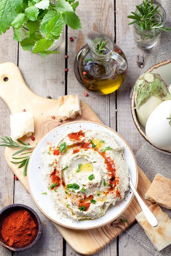 Добавляем молотый кумин, тахини или кунжутное масло, лимонный сок, чеснок, солим и перчим (канейским перцем). Подаём на стол.