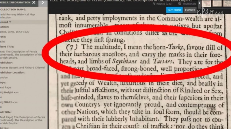 В книге 1676 года говорится, что большинство “прирождённых тюрков” (очевидно, туркмен) “до сих пор поддерживают (то есть почитают) своих варваров-предков и наносят скифские и татарские отметины на лбах и конечностях” (https://www.davidrumsey.com/luna/servlet/detail/RU...).