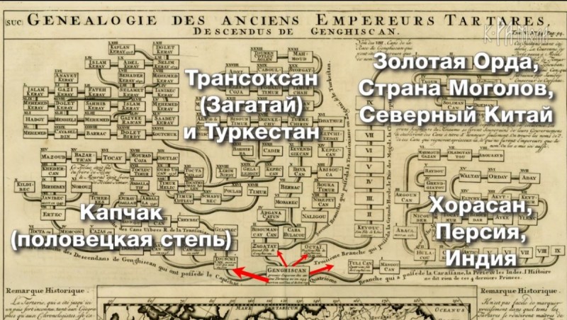 Откроем схему “Генеалогия древних императоров Тартарии, потомков Чингизхана” из книги “Исторический атлас” Николаса Гудевиля 1721 года. Перед нами схема потомков Чингизхана, которых авторы документа разделили на 4 ветви (https://upload.wikimedia.org/wikipedia/commons/5/5...).