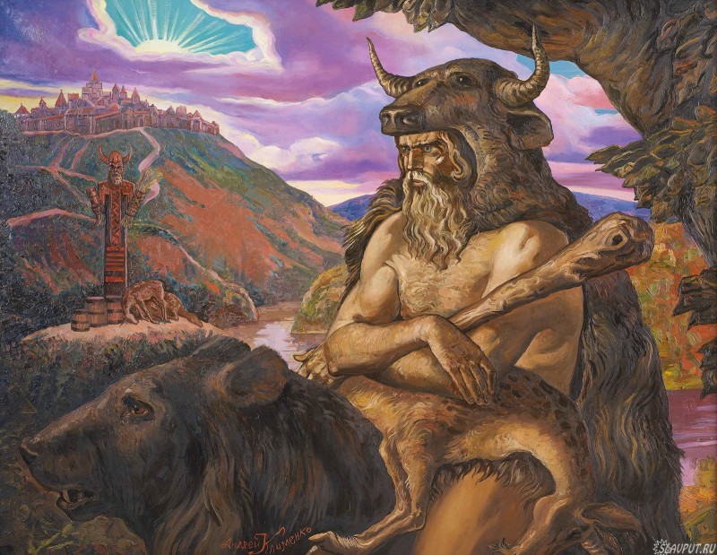 Еще в незапамятные времена, до того как посетить нашу Землю, Бог Велес пастушествовал в небесах. Он гонял по синему своду стада облаков, играл на свирели, которую некогда изладили для него сыновья Бога ветра Стрибога, и распевал песни о великих деяниях, кои дано свершить Богам и людям. А у громовержца Перуна, небесного владыки, была красавица-жена – богиня Дива. Она оставалась вечно юной красавицей. Ее золотоцветные волосы были убраны жемчугами, одежда изукрашена богатым шитьем и драгоценностями. Велес тоже любил красавицу Диву. Чуть, бывало, повеет теплом, чуть вылетят из райского сада Ирия жаворонки, неся на землю весну, начинает хмель любви бродить в теле небесного Бога-пастуха! Не в радость ему мирная жизнь, не в радость небесные красоты. Хочется потешить буйную плоть! Не в силах с собой справиться, Велес улучил миг, когда Перун отвернется, и похитил красавицу Диву. Что тут содеялось в небесах! Черные грозовые тучи – передовое воинство Перуна – стремглав понеслись к жилищу Велеса, чтобы испепелить его молниями, убить громами. Но тот заиграл на чародейной свирели братьев-ветров – и на пути Перуна встала неодолимая стена встречного ветра. Стрибог сурово бранил своих легкомысленных сыновей, давших в руки Велеса такое сильное оружие. А Велес наслаждался своей безнаказанностью и смеялся над обманутым громовником. А между тем Дива, задумала украсть эту свирель. Она подольстилась к Велесу, начала петь для него, танцевать. Ах, каким теплом повеяло в это время на земле и в сердце влюбленного Бога! Но когда Велес уснул, разнеженный, Дива схватила волшебную свирель и с такой силой отбросила ее прочь, что свирель улетела на землю и рассыпалась на тысячи обломков. Из них, между прочим, выросли тростник и камыш, из которых люди с тех пор и начали делать свирели да простенькие дудочки. В то же мгновение ветры перестали слушать Велеса и склонились перед молниями Перуна. И Громовержец прорвавшись к похитителю потребовал от Велеса чтобы он удалился в изгнание на землю. Велес и сам понял, что совершил непростительную глупость по отношению к своему брату Перуну, и раскаявшись отправился к людям обучать их землю обрабатывать и скот водить. Увидав, как жестоко наказан Велес, добросердечная Дива горько заплакала, и слезы ее теплым дождем пролились на землю. Растаяли остатки снега, зазеленели травы в полях и лугах, оделись листвою леса, а кое-где расцвели синие, точно небеса, цветочки. Это были слезы Дивы по Велесу, которого она жалела, и ни как не могла забыть. С тех пор цветы эти и называются – незабудки. Пожалел суровый Перун красавицу-жену и дал ей слово простить и Велеса. Но не сразу, а пока пусть поживет на земле. А Велес, чтобы не искушать Диву, которая все это время смотрела вниз, на землю, и любовалась им, принял образ медведя (В скифском варианте легенды у него была только голова медвежья, а тело человеческое, и скифы его прозывали Бер-баш, медвежья башка. Волхвы, которым покровительствовал Велес, в знак этого надевали на свою голову маску медведя). С тех пор так оно и повелось, лето Велес проводил на земле, в лесу, в образе медведя, украдкой помогая людям пасти их стада и оберегая коровушек от диких зверей: недаром зовется он «скотьим Богом», покровителем пастухов. Все это время стада облаков в беспорядке бродят по синим небесным пастбищам – именно поэ