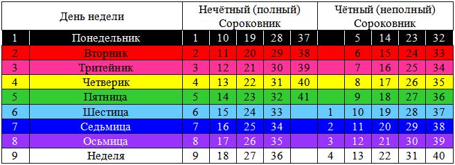 Нечетный месяц – полный: в неделе девять дней: Чётный – неполный: