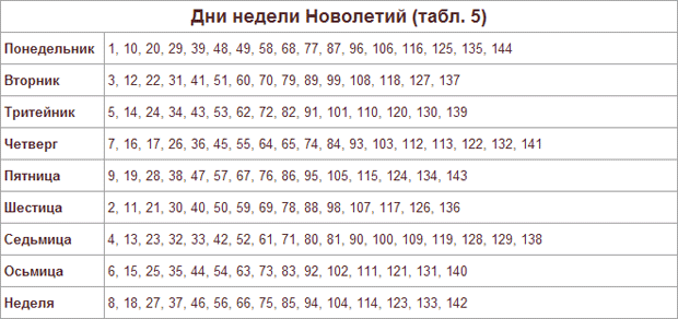 Таблица. Дни Недели, с которых начинаются годы Круголета.