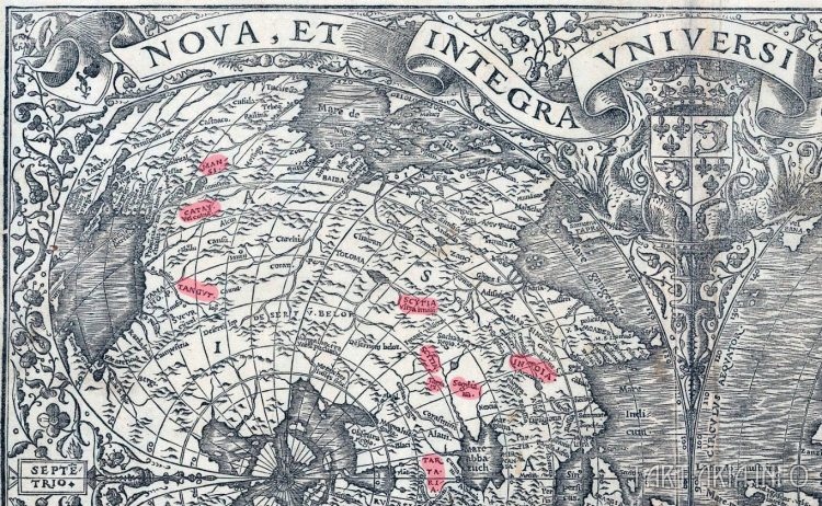 Интересно, что все упоминают карту Меркатора, на которой изображен материк в районе Северного полюса, и масса предположений о том, откуда он мог эти сведения почерпнуть (в том числе и у меня была статья на эту тему «Гиперборея на карте Меркатора») Но вот, пожалуйста, карта, изданная на 38 лет раньше карты Меркатора, с изображением материка в районе Северного полюса. Более того, изображение расположено таким образом, что создается впечатление вида сверху, примерно с высоты спутника, который сейчас делает снимки для Google-Earth. Эффект, конечно, создается нанесенными линиями меридианов. На этой карте красным цветом я пометила знакомые мне надписи. Это Тартария в районе бывшей Сарматии Азиатской, далее Скифия (идем снизу вверх), Согдина, Индия, Скифия Ultra Imani (если смогла правильно прочитать) – Скифия по ту сторону горы Имани (у Птолемея – Имаум). Далее очень обширные пустыни Лоп и Белор, и за ними: Тангут, Катай, Манси (Чины нет). Такое впечатление. Что Азия соприкасается с Северной Америкой.