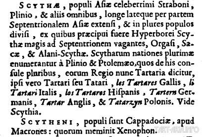 «Скифы, народность Азии, наиболее известны по Страбону, Плинию, и другим, занимающие большую часть Северной Азии. Делятся на многие народы, главными из которых были гиперборейские скифы, в большей мере кочевники, оргасы, саки, и аланы-скифы. Больше всего скифских народов перечисляет Плиний и Птолемей; их страна сейчас называется Тартарией, и их называют тартарами или татарами.»