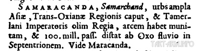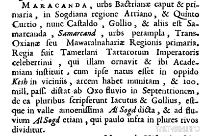 «Мараканда –город Бактрианы, главный и знаменитый, в Согдиане по Арриано и Квинту Курцию Руфу (римский историк, написавший «Историю Александра Великого Македонского» -прим. мое), сейчас Самарканд, по Касталдо, Голлиусу (нидерландский востоковед, математик, астроном и путешественник 16-го века) и других, самый крупный город региона Трансоксании или Мавераннахра. Располагался двор знаменитого Тартарского императора Тамерлана, который создал там академию.»