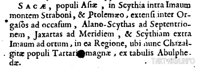 «Саки – народность Азии, проживающая в Скифии Внутреннего Имаума по Страбону, Птолемею, между оргасами на западе, алано-скифами на севере, яксартами на юге, скифами Внешнего Имаума на востоке. Сейчас они называются чазалгитским народом Великой Тартарии, исходя из карты Абу-ль-Фида.»