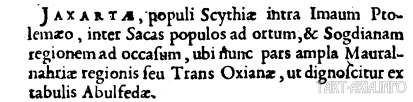 «Яксарты — народность Скифии Внутреннего Имаума, по Птолемею, проживающие между саками на востоке и Согдианским регионом на западе. Который в настоящее время является частью большого региона Мавераннахр или Трансоксания, как это можно определить по карте Абу-ль-Фида.»