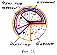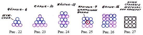 Поэтому мы можем сказать следующее из того, что мы записали: из этого круга 6 секторов можно отнести к черным, 9 к красным, 10 к серым, 12 к желтым. И 16 это белым. Далее женские обозначим крестиками, а мужские кружками. И вот у нас на круге группа, как бы, определяющая человеческую суть. Теперь смотрим, сколько у черных получается мужских кружков и женских крестиков? По три 3, всего 6. У красных всего 9, сколько мужских и женских? 5 мужских и 4 женских. У серых всего 10, по 5 мужских и по 5 женских. У желтых всего 12: по 6 мужских кружков и по 6 женских крестиков. И у белых – полный круг, по 8 мужских и женских. Т.е у всех совпали с рисунками 18-22.
