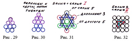 Мы также знаем, что вот эти, которые нестабильные – цыгане, Да? Иногда их так называют. Они же ушли из Индии куда? Сюда — в Бутан, Тибет, а потом их оттуда вообще изгнали. И их сейчас принято называть – цыгане, что означает: «Это не имеющие пути». Но заметьте, ведь они умные, почти как желтые, умнее черных, получились, как бы на один порядок, повыше серых. А какой же серый потерпит, чтобы ему кто-то указывал? Вы же видите (рис.30) – шесть плюс пять = одиннадцать, а у серых только 10. Т.е вроде бы верхняя часть системы (рис.26) имеет треугольную основу, т.е. выдает генотип серых и негроидов, но внутренняя основа, как бы ликом похожи, а нижняя часть тела, она как бы ближе к желтому. Т.е произошло что? Их начали изгонять. Но пока они жили, они же узнавали все таинства, знания, которые потом использовали в своих целях. Поэтому мы что можем наблюдать в Индии? Светлые, светлее желтых – индусы так называемые. И вон ходят по улицам полунегры, полусерые, и все говорят, ну, опять к нам – цыгане. Которые говорят: А мы с Индии вышли. Но есть там у них чуть ли не вообще черные, а здесь – светлые. Поэтому не одну, а обе вот эти системы (рис.29 и рис.30) и называют – цыгане.