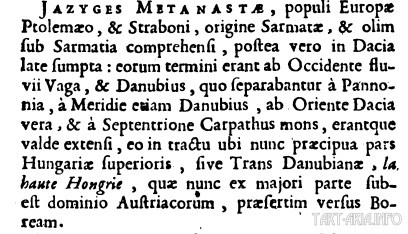 «Языги Метанасты, народность Европы, по Птолемею и Страбону, по происхождению сарматы и в прошлом входили в состав Сарматии. Позже Дакии, располагались к востоку от рек Вага и Дунай и к югу от Карпатских гор. Сейчас большую часть этой территории занимает Верхняя Венгрия, которая находится под владычеством Австрии, особенно в северной части.»