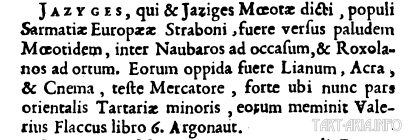 «Языги, которые языги азовские, народность Сарматии Европейской по Страбону, проживавшие около Азовского моря, между наубарами на западе и роксоланами на востоке. У них были города Лианы, Акра и Кнема, по словам Меркатора, в настоящее время является восточной частью Малой Тартарии, упоминается Валерием Флакком в книге о походе аргонавтов.»