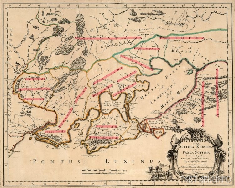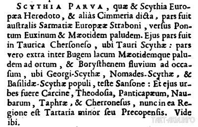 «Малая Скифия, или Скифия Европейская по Геродоту. Ранее называвшаяся Киммерией, была южной частью Сарматии Европейской по Страбону. Возле Понтийского (Черного) моря и Меотийского озера (Азовского моря). Ее часть была в Таврике Херсонесской, где Скифия Таврическая: часть Меотийского озера на востоке, реки Борисфен (Днепр) на западе, где георги-скифы (колхи), номады – скифы, басилиды-скифы, говорил Сансон. Ее города были: Каркин, Феодосия, Пантикапей, Naubarum, Тафра и Херсонес. Сейчас Малая Скифия называется Малой Тартарией или Перекопом."