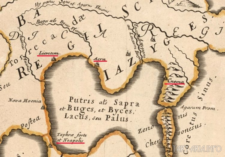 На карте кроме упомянутых городов показано еще несколько городов без названия. Если на карте справа показана Арабатская стрелка, то город Кнема – это, возможно, современный Геническ. И прямо на Крымском перешейке расположен город Taphra forte et Neapolis – Сильная Тафра и Неаполис. Неаполис – это новый город или Новгород, другими словами. Возможно, это современные Армянск или Красноперекопск? Или, скорее всего, эти города сейчас разрушены и засыпаны точно так же, как все остальные античные города Крыма и Кубани, о которых я уже писала в 1-й части этого цикла. Так как на более поздней карте этой территории этих городов уже нет, а места эти, вплоть до Центральной Украины уже названы «loca deserta» (пустынные места). Об этом я писала в 1-й части этого цикла.