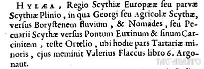 «Гилая – область Скифии европейской или Малой Скифии по Плинию, в которой Георгия или Агрикола Скифия, в районе реки Борисфен (Днепр), и номады (кочевники) или Скотоводческая Скифия по направлению к Черному морю и Каркинитскому заливу, по словам Ортелио. На этом месте сейчас Малая Тартария. Ее упоминает Валерий Флакк (римский поэт, 1 век н.э.) в своей книге о походе аргонавтов.»