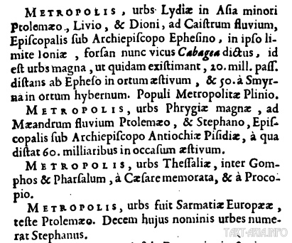Метрополис – город Лидии, в Малой Азии. Метрополис – город Великой Фригии, на реке Меандр. Метрополис – город Фессалии, между Комфосом и Фарсалией. Метрополис – город Сарматии Европейской, по словам Птолемея.