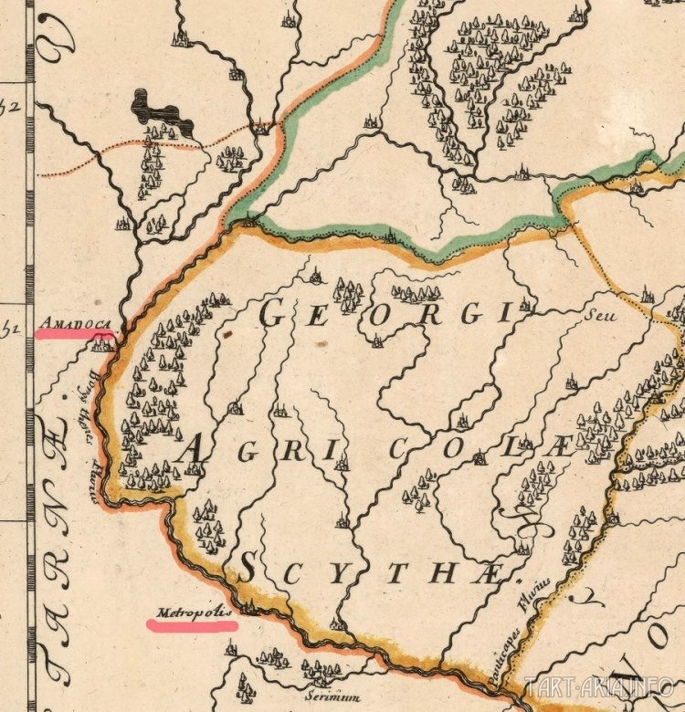 На этом фрагменте показаны два города: Amadoca и Metropilis. Amadoca –это Киев, судя по тому, что находится почти на развилке рек Днепр и Десна. Да и М. Бодран, «География в алфавитном порядке», это подтверждает. А Metropilis тогда – Черкассы?