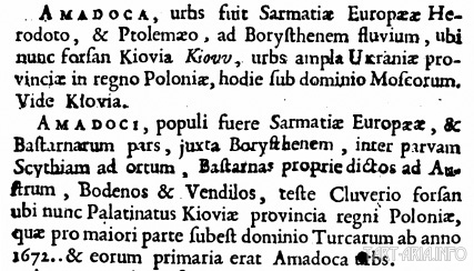 Амадоки, была народность Сарматии Европейской, часть Бастарнии, рядом с Борисфеном, между Малой Скифией на востоке, бастарнами на юге, боденами и вендами, по словам Клювера. Сейчас это Киевское воеводство королевства Полония, которое находится большей частью под владычеством турков с 1672 года. Их главным городом была Амадока.»