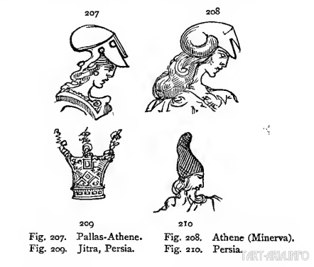 Подписи к картинкам: 207 Афина-Паллада, 208 Афина (Минерва), 209 Джитра, Персия, 210 Персия. Видимо, такая форма головного убора с гребнем вперед для мужчины и гребнем назад для женщины имела какой-то глубокий сакральный смысл, раз была так распространена и даже перенята священниками ВСЕХ религий. Возможно, защита от какого-то воздействия или усиление каких-то способностей. А может, и то и другое, и еще третье… По этому гребню можно судить о возрасте изображения женщины в таком головном уборе: если гребень повернут вперед, значит, создатель этого изображения уже не имеет понятия о его сакральном смысле, т.е. это — более позднее изображение.
