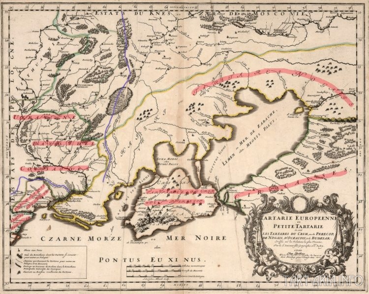 Вся эта информация относится к рассматриваемой нами карте «Киммерия, названная позже Скифией Европейской или Малой Скифией». Эта карта была изготовлена в 1665 году. Затем на этой карте была стерта дата и изменены названия, и получилась карта Малой Тартарии: