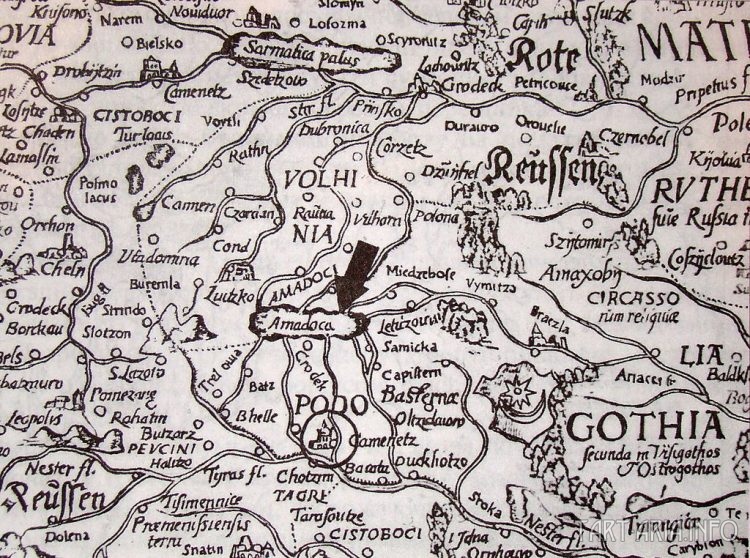 «Амадока – город Сарматии Европейской по Геродоту и Птолемею, на реке Борисфен (Днепр). Сейчас это, возможно, Киев, город большой провинции Украина в королевстве Полония, в настоящее время находящееся под правлением Московии. См. Киев.