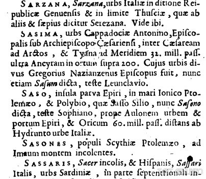Примечательно, что в Географической Энциклопедии М. Бодрана (да и других энциклопедиях 17-го века) ничего ни о ахеменидах, ни о сасанидах не сказано. Есть упоминание о городе Сасима в Каппадокии, Сасо – остров в Малой Епирии (ныне Греции) и сасоны – народность Скифии по Птолемею, жители гор Имаум: