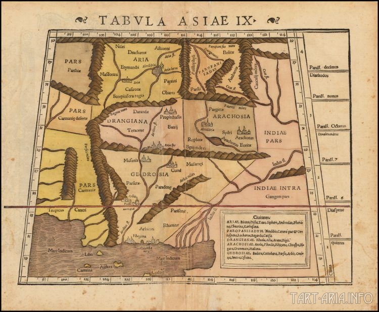Написано, что автор карты Себастьян Мюнстер, но она точно такая же, как в книге «География Птолемея» 1545г. Александрии и тут присутствуют, одна в Арии и одна в Арахозии. Столицу Арии Арию переименовали в Герат. Этот город и сейчас так называется: