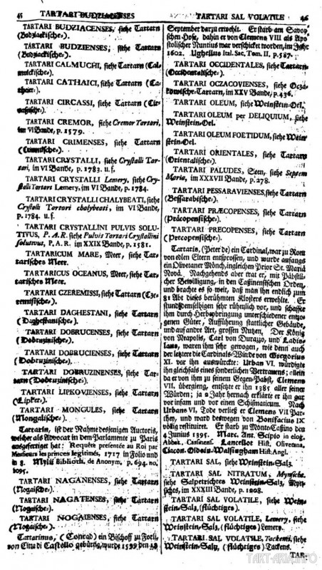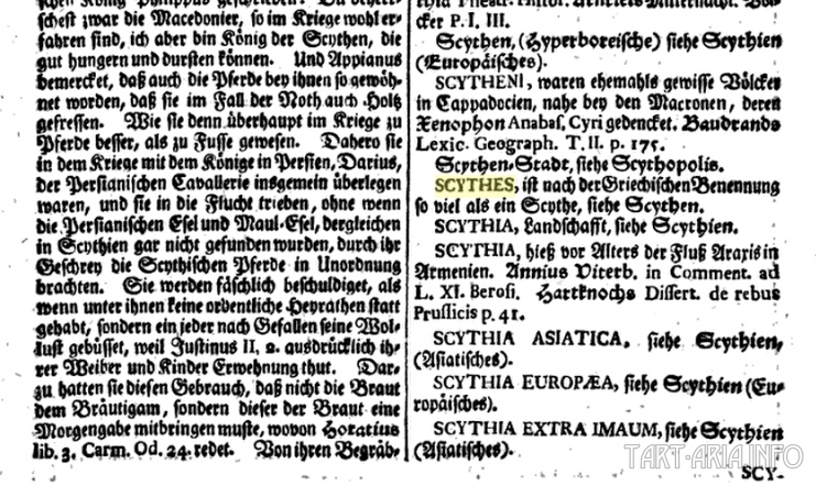 Здесь перечислены все те же самые области Скифии, что и у М. Бодрана, и так же рассказано во что они были переименованы. К сожалению, не упоминается причина этого переименования. И намного больше названий различных областей Скифии присутствует в «Grosses vollständiges Universal Lexicon aller Wissenschaften und Künste» (Большой универсальный словарь всех наук и искусств), состоящий из 68 томов (и каждый том примерно на 2000 страниц), опубликованный Иоганном Зедлером в период с 1731 по 1754 годы. Это было одно из крупнейших печатных энциклопедических изданий, включающая биографию живых людей в систематическом виде. В 36-м томе этого словаря о Скифии: