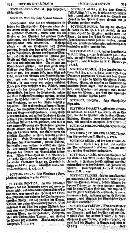 Написано на старонемецком, поэтому читать очень тяжело. Хорошо читаются только заголовки: скифены, скифы, Скифия, Скифия Азиатская, Скифия Европейская, Скифия Внешнего Имаума, и далее: