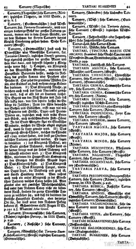 Здесь частей Тартарии перечислено больше, чем у М. Бодрана. В принципе, каждой скифской области и каждому скифскому народу соответствовали свои тартарские названия. Напоминаю, что этот географический словарь не единственный. Таких энциклопедий, справочников и словарей было выпущено в 17-18-м веках очень много.